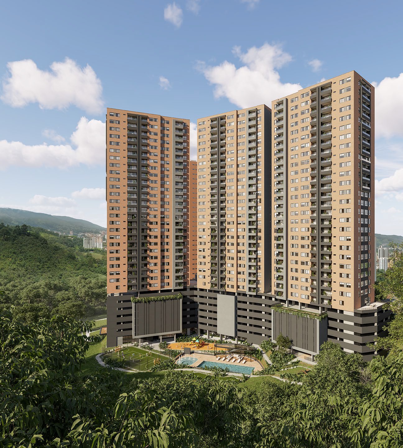 Son 3 torres de 22 pisos con 6 apartamentos por piso con un total de 450 apartamentos.