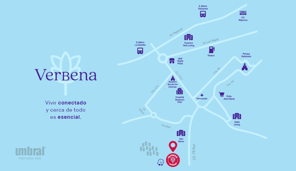 VERBENA Sabaneta es un proyecto de Apartamentos de 3 torres de la constructora UMBRAL Propiedad Raiz ubicado en Sabaneta en la Carrera 78 sur con 40 Sabaneta, Antioquía. Sector San Remo.
